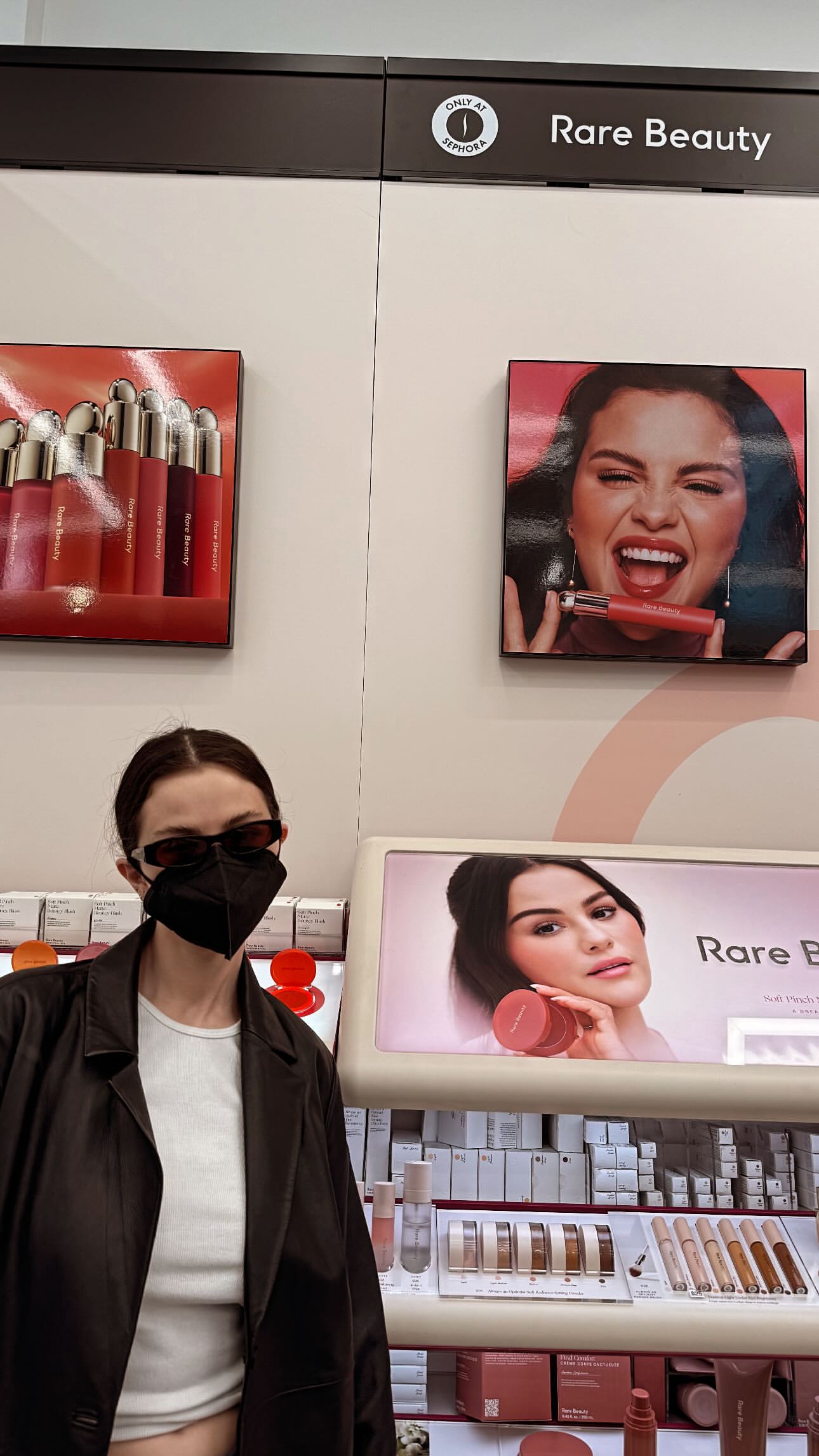 Новое фото Селены, позирующей около стенда с косметикой Rare Beauty в магазине Sephora, загруженное в истории Инстаграма.