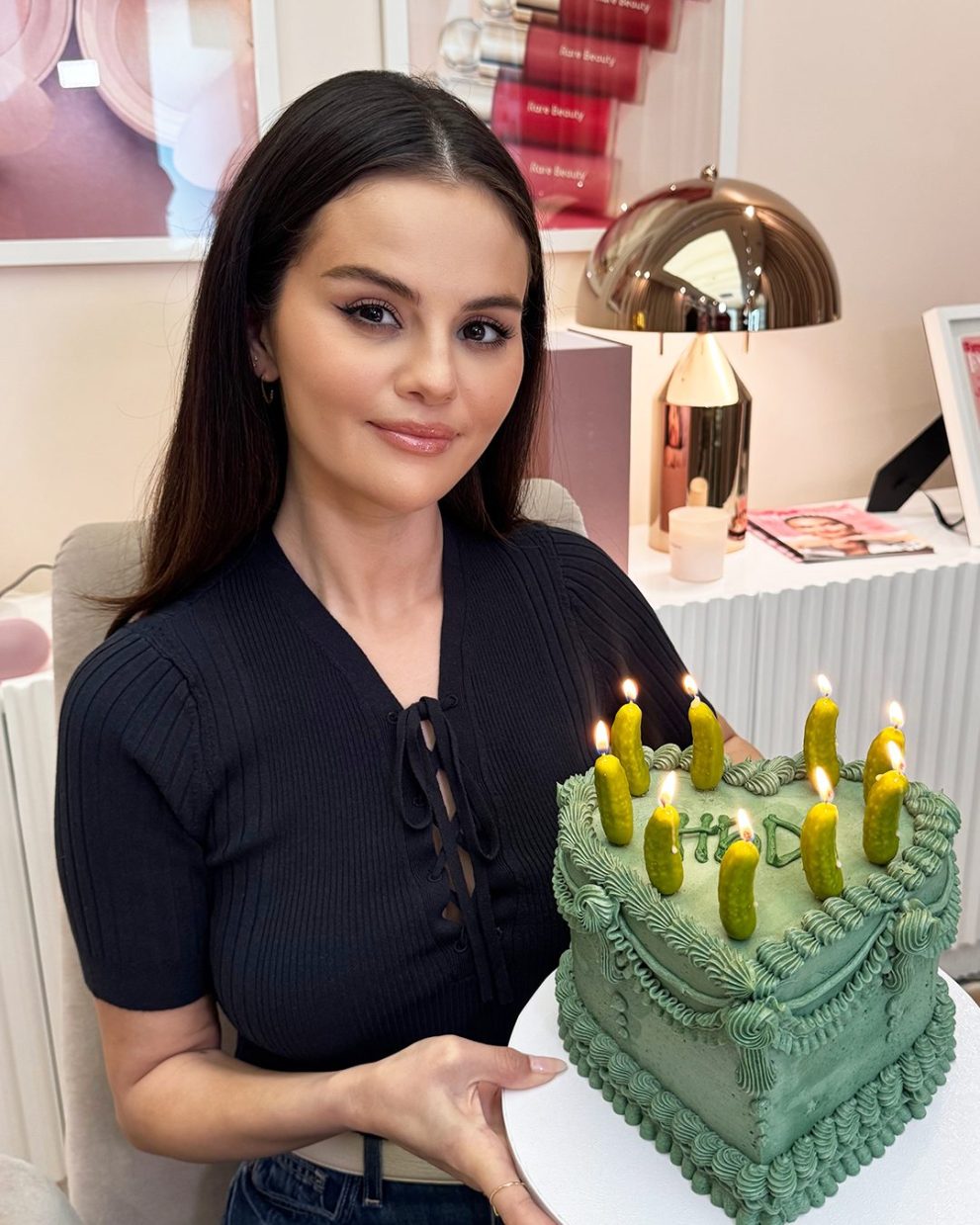 Селена отпраздновала свой 33-й День рождения в офисе Rare Beauty, с тортом украшенным праздничными свечами в форме соленых огурцов! В честь своего Дня рождения, Селена анонсировала новый благотворительный проект — ‘Rare Impact Fund Giving Circle‘.