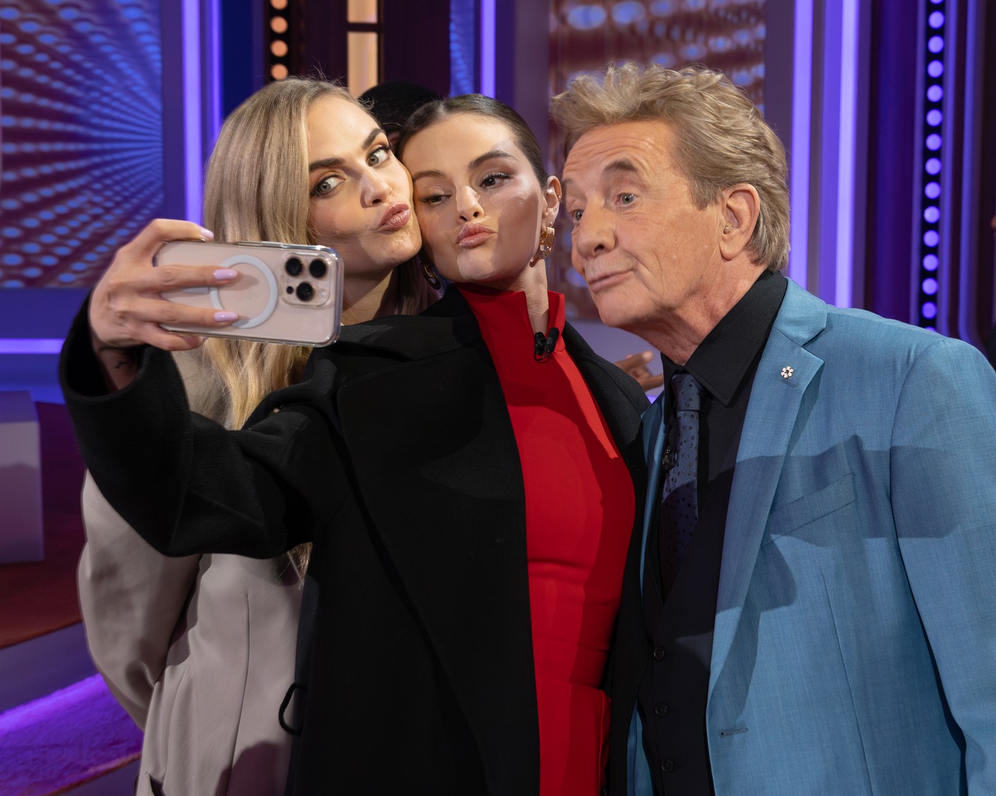 Новое селфи Селены, Кары Делевинь и Мартина Шорта за кулисами на съемках игрового шоу The Match Game.