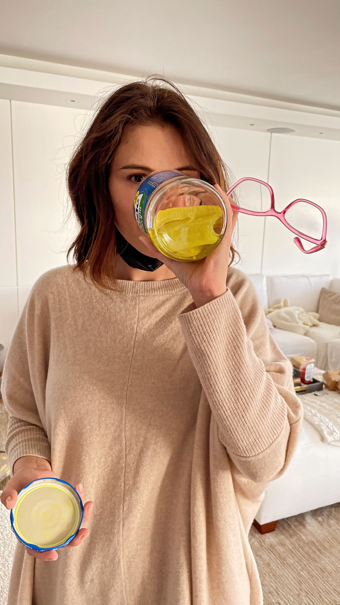 На новом селфи, размещенном в истории Инстаграма, Селена пьет рассол из банки с солеными огурцами.