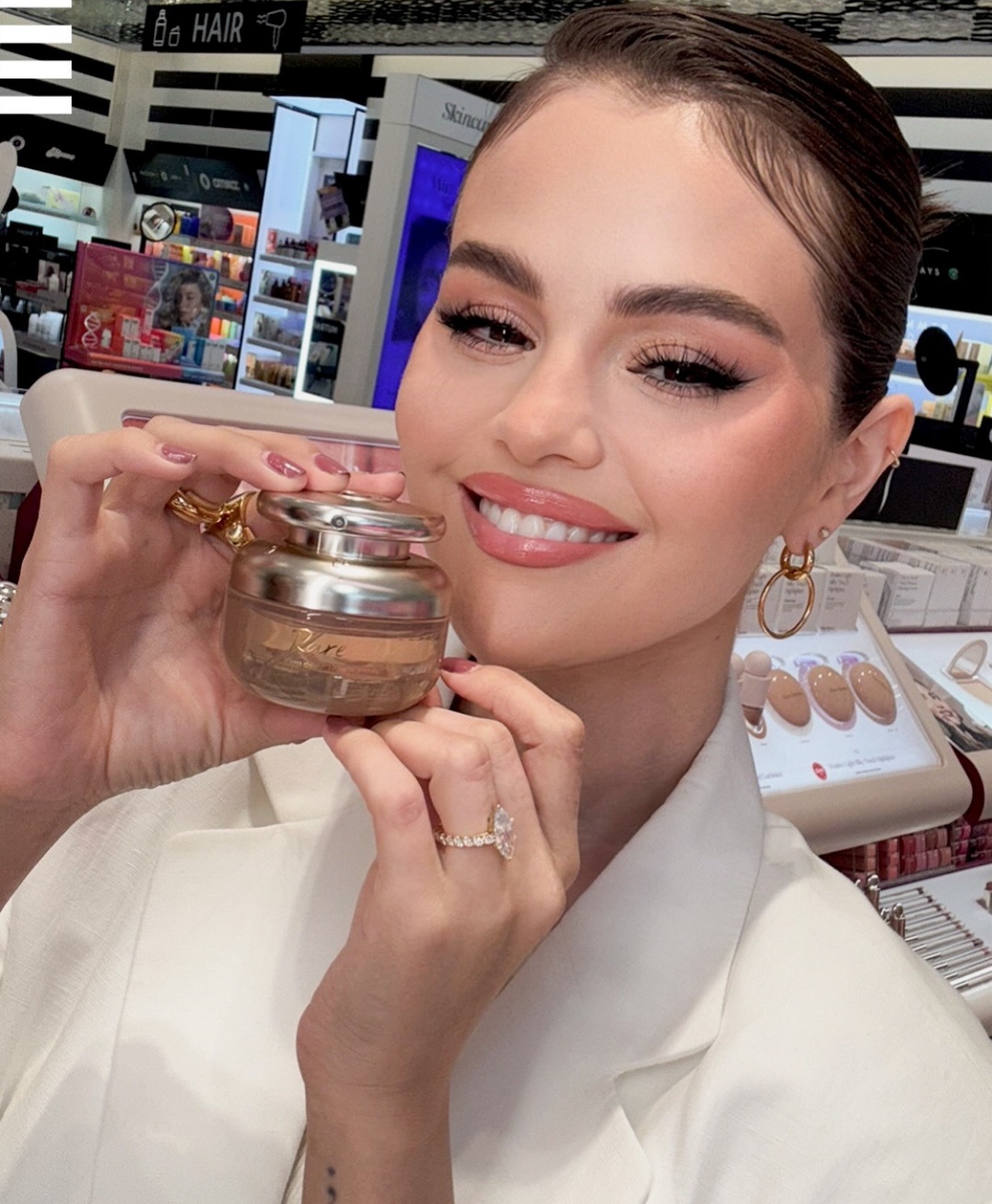 Новое селфи Селены, позирующей с парфюмом от Rare Beauty в магазине Sephora.
