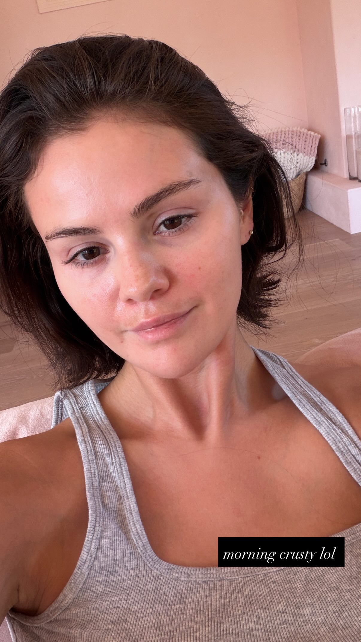Селена позирует для мэйкап фри селфи, которое она выложила в историю своего Инстаграма.