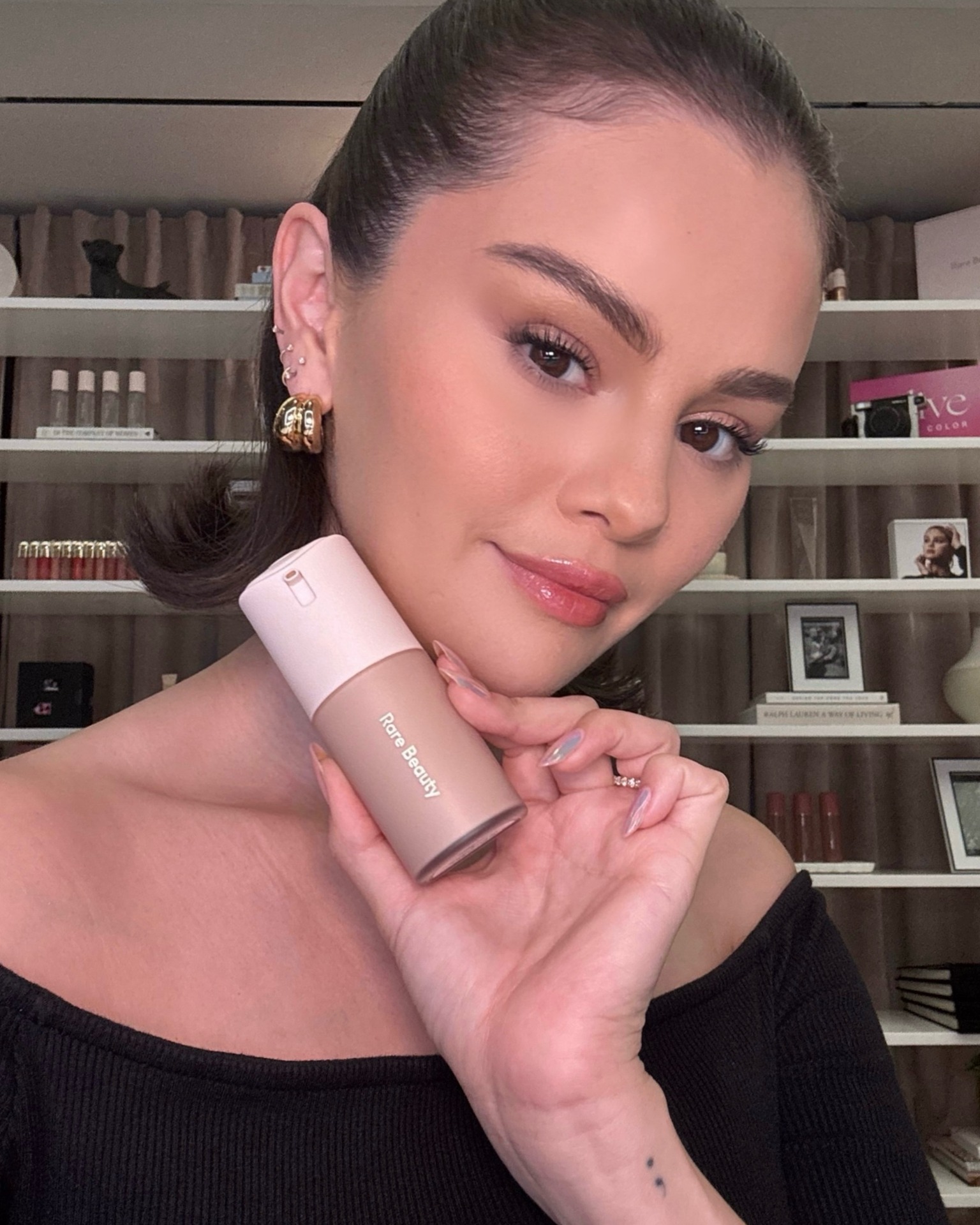 Новое фото Селены, рекламирующей тональную основу «True to Myself Natural Matte Longwear Foundation» от Rare Beauty.